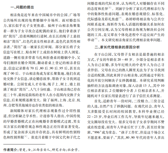 婚恋成为当代年轻人的一大难题,成为父母焦虑的重要来源。部分父母通过相亲角平台为子女解 决择偶问题,该方式被称作“家长代理相亲”。本文通过调查相亲角家长代理相亲,发现家长代理相亲效率低, 其效率和效果取决于亲子关系的信任程度。同时,相亲角成为家长社交空间,具有社会交往和情感交流的隐性 功能。