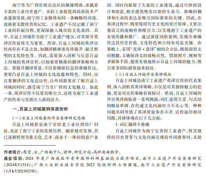 南宁作为工业发展的重要城市,拥有丰富的工业遗产资源。在全球化背景下,如何对工业遗产展 开英译宣传,成为推广城市文化、吸引国际关注的关键。本文以百益上河城为例,深入剖析其工业遗产英译宣 传的现状与挑战,提出针对性策略,旨在为南宁以及更多城市的工业遗产英译宣传提供参考,以促进城市文化 的国际传播与交流。