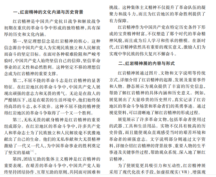 本文以红岩精神展为例,分析其在当代社会中的重要性及其对公众文化素养提升的作用。通过研 究红岩精神展的教育内容、传播方式及影响效果,提出一系列策略,以期提高公众文化素养和增强文化自信。