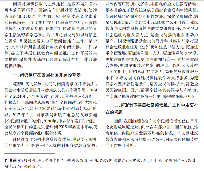 阅读推广是全民阅读的重要组成部分,是新时代赋予社区教育的新使命和新任务。基层社区教育 是全民教育的重要组成部分,做好阅读推广工作,不仅能发挥社区教育功能,还能将社区教育与居民的日常生 活紧密联系起来。本文以贵州省基层社区教育中的阅读推广工作为例,提出基层社区教育阅读推广工作开展 的主要措施。