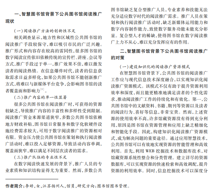 在智慧图书馆背景下,公共图书馆的阅读推广工作呈现出新的特点和挑战。本文分析了公共图书 馆阅读推广现状,发现推广渠道单一、活动吸引力不足、受众参与度不高等问题,在此基础上提出提升阅读推广 效果的对策,包括多元化的媒介模式、规范化的推广体系、基于智慧技术的创新应用。