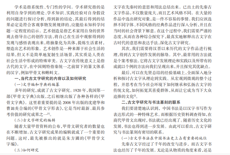 文字是记录中华上下五千年璀璨文明的媒介,不可忽略的是,它本身也是我国璀璨文明中的一部分。从历 史上看,文字的变革与我国早期的书法史是处于同一时期的,由此可见,书法史的研究和古文学有密切的联系。所以,对 古文字开展研究,有利于对书法镌刻创作进一步探索。什么是古文字?书本中的传统文学观认为,先秦时期的汉字被称 为古文字。但是现代文学观认为,秦始皇统一中国之后所使用的小篆也属于古文字的范畴。20世纪 70年代后,我国出 土了不少秦朝和西汉早期的简牍和帛书,里面记录了大量的古文字,带有不一样的书法美感。本文主要讨论古文字研究 对书法篆刻创作的影响。