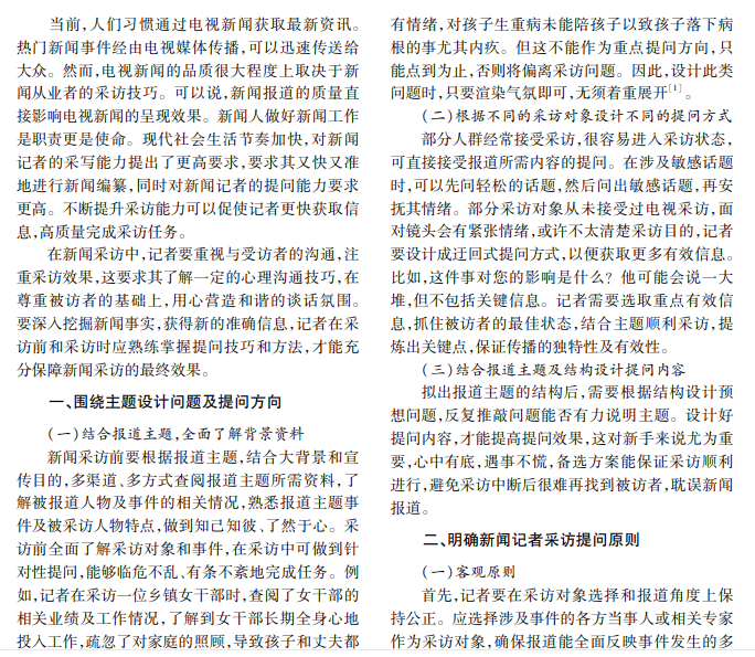 完整清晰地呈现新闻报道主题是新闻工作者的目标。为避免在采访中出现疏忽和遗漏,提升新闻 收视率,记者提问水平至关重要,决定了新闻作品质量。电视新闻采访记者需提升现场提问能力,掌握提问技 巧和应对方法。本文分析和探索精进新闻采访提问技巧的策略。