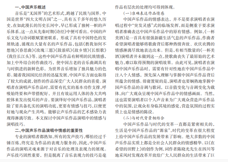 中国的声乐历史可以追溯到先秦时期,中国声乐艺术在民族环境的滋养中穿梭于朝代更迭之中。“美”是 体验声乐创作和演绎共性的守则。随着我国国民经济的发展,尤其是我国对外交流与合作工作的进一步展开,我国的 音乐事业逐步发展,涌现出了大批优秀的中国声乐作品,深受广大人民群众的喜爱。要演绎好中国声乐作品,演唱者除 了要具备深厚的演唱功底之外,更要有深刻的情感表达,以便更好地与观众产生共鸣,能够让声乐作品的艺术感染力得 到淋漓尽致的发挥。本文首先阐述了中国声乐作品演唱中情感的重要性,其次分析了中国声乐作品演唱中技巧的重要 性,并得出结论:情感与技巧早已成为中国声乐作品演唱中不可或缺的两部分,情感是“线”、技巧是“珠”,两者密切相 关,不可分割。