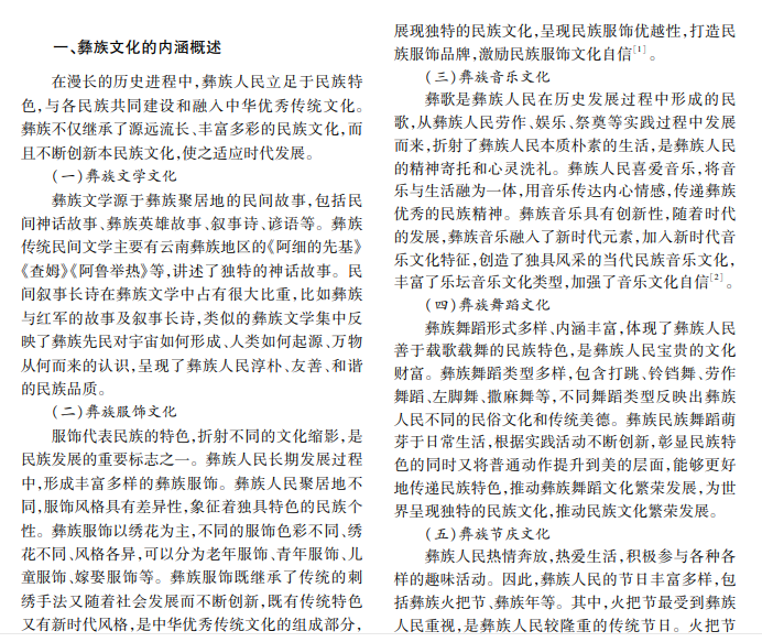彝族人民在历史发展进程中创造了具有民族特色的彝族文化。彝族文化是彝族人民集体智慧的 结晶,具有丰富的文化内涵,象征着本民族的文化精髓。彝族文化具有一定的时代价值,凝结了彝族人民真善 美的民族情怀,体现了诚信友善的时代精神,展现了彝族人民热爱自然、敬畏自然的生态理念,传递了爱国主义 情怀,是实现中华民族伟大复兴的力量之一。