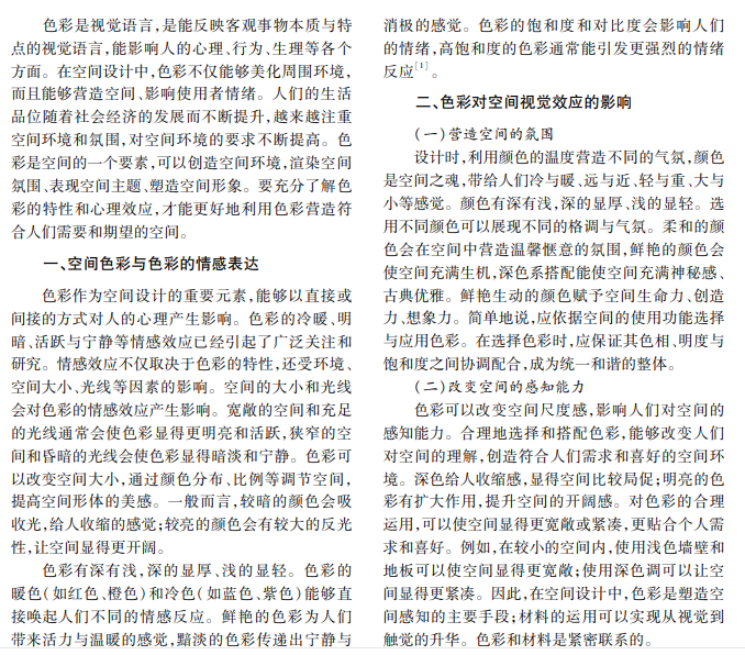 色彩在空间中的应用可以提高人们对空间环境的感知能力,建立正确的空间视觉效果。通过分析 色彩在空间中产生的视觉效果,深入探讨空间中色彩的呈现方式及基本原理。本文以色彩和空间视觉效应为 切入点,通过案例分析色彩在不同空间中产生的视觉效果。