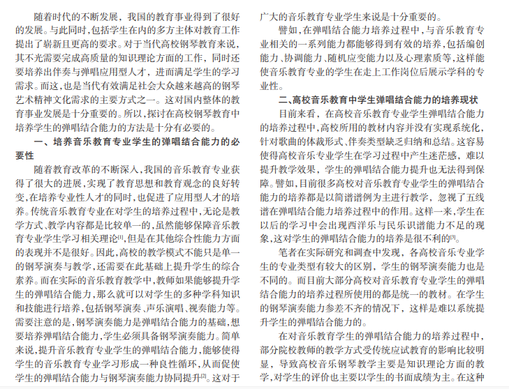随着现代社会经济的迅速发展,社会大众需求开始朝着精神文化方向发展。钢琴艺术是人们追求的精神 文化的一种。高校钢琴教育工作与其他学科教育工作类似,不仅要让学生学习钢琴的相关知识理论,还需要将学到的 知识理论落实到实践层面,使学生成为伴奏与弹唱的应用型人才。这也是现代高校钢琴教育工作的主要目标之一。本 文首先对高校钢琴教育中培养学生的弹唱结合能力的重要性和必要性进行介绍,然后针对高校钢琴教育中培养学生的 弹唱结合能力的现状进行分析,并提出针对性的建议和策略,主要目的在于促进高校钢琴教育工作效果的提升。