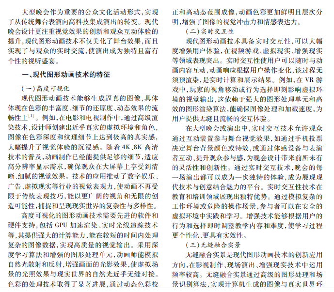 在图形动画领域,设计师能通过工具创造前所未有的视觉奇观,实现演出的艺术表达。技术的融 入不仅改变了舞台设计的传统概念,而且提高了观众的参与感和体验感。通过技术革新,晚会成为多感官体验 的场所,观众不再是被动的接受者,而是成为互动体验的一部分,为文化演出行业带来新的发展方向和可能性。