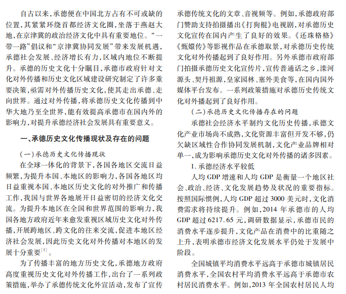 承德历史文化十分丰富,承德历史文化对外传播要坚持政府主导,通过整体布局,形成体系化外宣 格局。可借助互联网和人工智能,形成涵盖多媒体的传播路径,构建承德历史文化对外传播平台,提升承德历 史文化传播工作质量。本文针对承德历史文化对外传播的不足,提出对外传播策略。