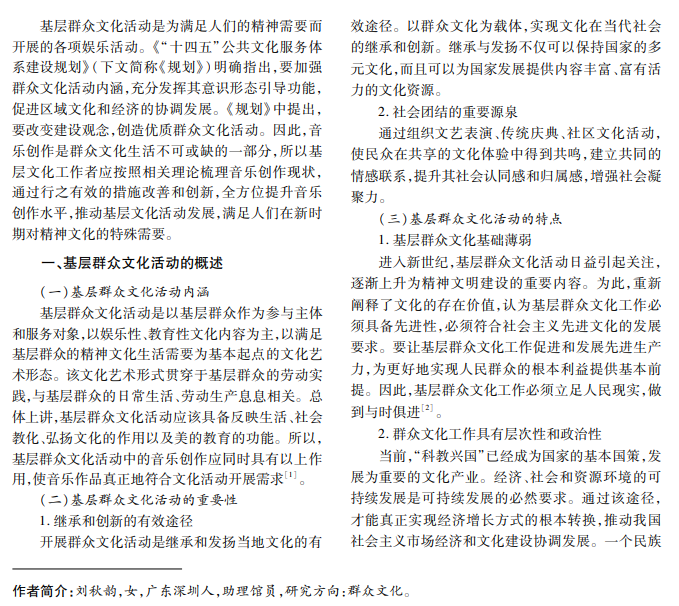 音乐创作是我国基层群众文化生活的一种主要方式。在传统的基层群众文化活动中,音乐创作存 在资金短缺、创作环境不佳、群众水平较低等问题,无法满足人民群众的文化审美、精神愉悦需求,必须实施改 革和创新,保证音乐创作在新时期更好地发挥导向作用。本文探索基层群众文化活动的音乐创作创新策略。