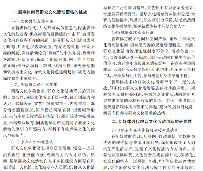 新媒体时代为群众文化活动插上腾飞的翅膀,对其创新发展提出新的挑战。文化内容良莠不齐、 活动形式趋同、人才匮乏、管理滞后等问题亟待破解。新媒体传播顺应趋势、满足群众多元文化需求、提升基层 文化活力,成为新时代群众文化活动变革的时代命题。本文立足新媒体语境,系统剖析群众文化活动面临的困 境,深入阐述创新发展的现实需求,从内容供给、传播方式、组织模式、管理机制等维度提出一系列创新策略。