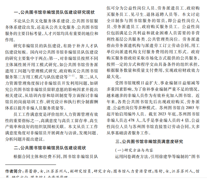 本文以馆员队伍中占比较高却容易被忽视的非编馆员为研究对象,从员工满意度角度出发,发放 调查问卷,与非编馆员及其直接管理层访谈,基于满意度水平较低的维度提出非编馆员队伍建设策略,为公共 图书馆人力资源管理工作提供借鉴。
