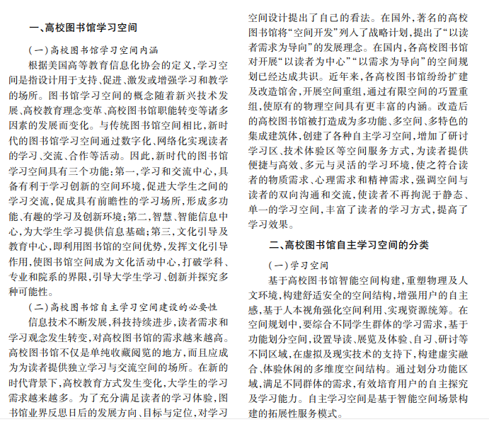 随着信息技术的进步及数字阅读方式的普及,图书馆逐渐从封闭走向开放,由以资源为中心转变 为以读者为中心。为满足读者多样化学习需求,须重新规划馆内功能结构,图书馆学习空间建设成为潮流。本 文探讨高校图书馆自主学习空间建设途径。