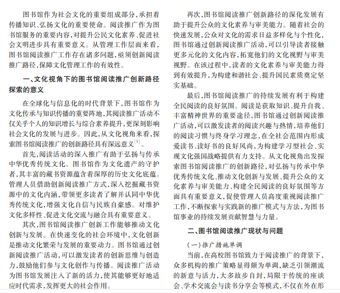 公共文化服务体系不断发展,图书馆作为文化传承与知识传播的重要阵地,其阅读推广工作日益 受到重视。本文探究文化视角下的图书馆阅读推广创新路径,旨在提高阅读推广效果,促进文化传承,提升公 民文化素养。