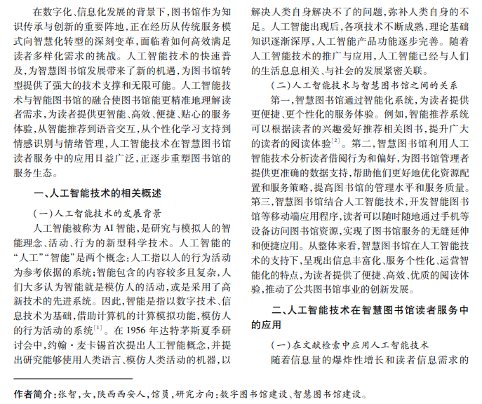 智慧图书馆是图书馆变革的标志性成果,通过集成物联网、大数据、云计算、人工智能等先进技术, 实现了服务模式创新和服务质量飞跃。其中,人工智能技术的引入丰富了图书馆服务手段、深刻改变了读者的 阅读体验和知识获取方式,为智慧图书馆发展带来一系列挑战。本文深入剖析人工智能技术在智慧图书馆读 者服务中的应用面临的挑战,提出应对策略与建议,以期为智慧图书馆发展提供参考。
