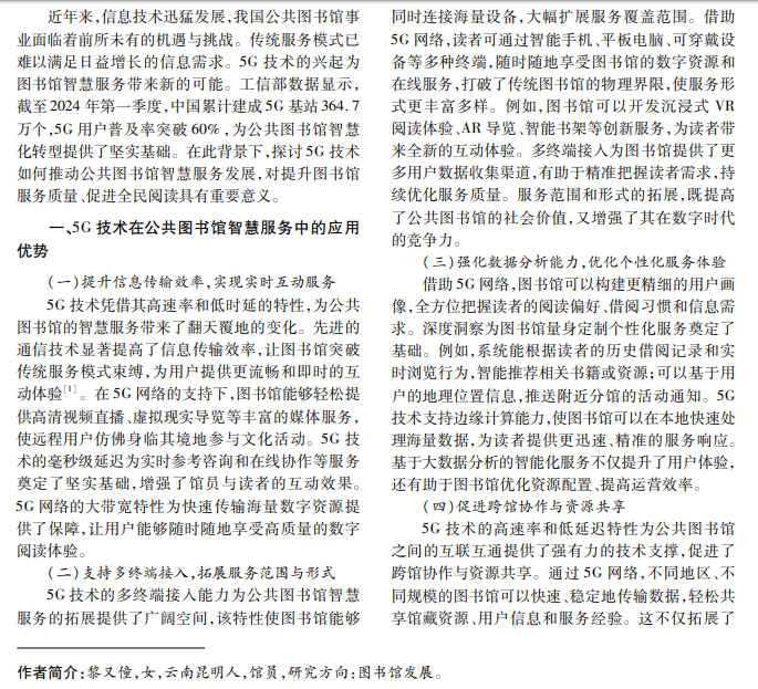5G技术的迅速发展带给公共图书馆智慧服务新的机遇与挑战。智慧服务已成为公共图书馆转型 升级的重要方向,对提升公共图书馆服务质量和效率具有重要意义。本文以 5G技术在公共图书馆智慧服务中 的应用为切入点,分析 5G技术在公共图书馆智慧服务中的应用优势,探讨了我国公共图书馆智慧服务发展面 临的挑战。