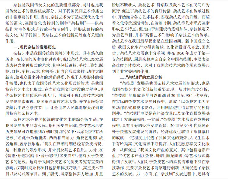 现代杂技与“杂技剧”转型是我国文化市场变革的重要表现,对于我国文化产业建设以及文化艺术传承有 非常重要的作用。本文对现代杂技创作以及“杂技剧”转型进行了分析研究,简要阐述杂技艺术以及“杂技剧”的发展历 史,并以《敦煌神女》作品为例,阐述了现代“杂技剧”创作中需要把握的要点。