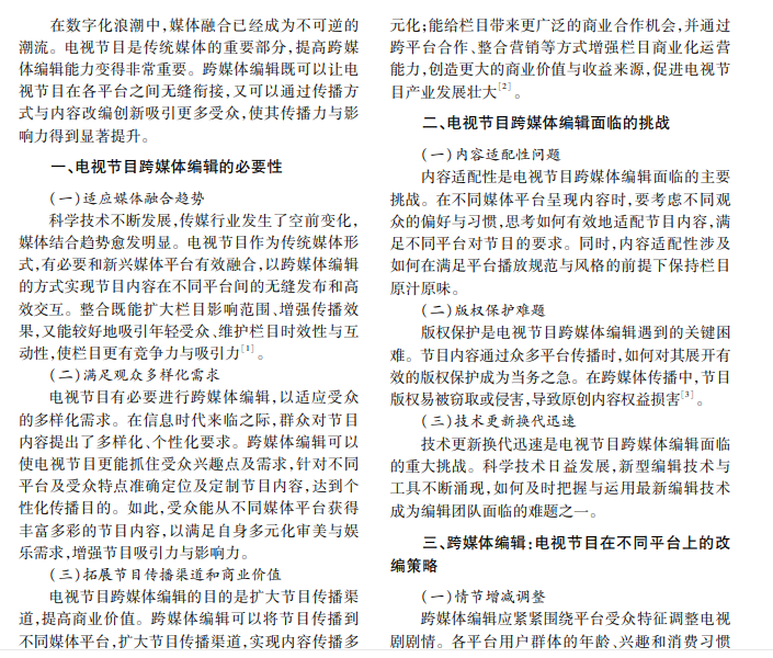 跨媒体编辑在满足受众多样化需求的同时拓宽了节目传播渠道,提高了节目商业价值,但挑战接 踵而至。通过情节调整、角色塑造及主题深化等多平台改编策略,可满足多平台特点及受众需求。互动式体验 设计、短视频剪辑及传播、虚拟现实及增强现实技术等创新手段给电视节目注入了全新生机与可能。