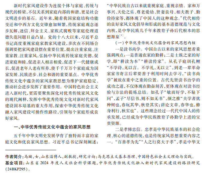 中华优秀传统文化中蕴含的读书尚学、孝悌忠信、至诚至实、勤俭节约等家风文化精神,是建设新 时代文明家庭的资源宝库。传承和弘扬优秀传统家风,要从新时代家风建设的客观实际出发,丰富家风建设载 体,拓宽家风建设视野,创新家风建设传播方式,完善传承保障体系,积极探讨中华优秀传统文化融入家风建设 的策略与路径。