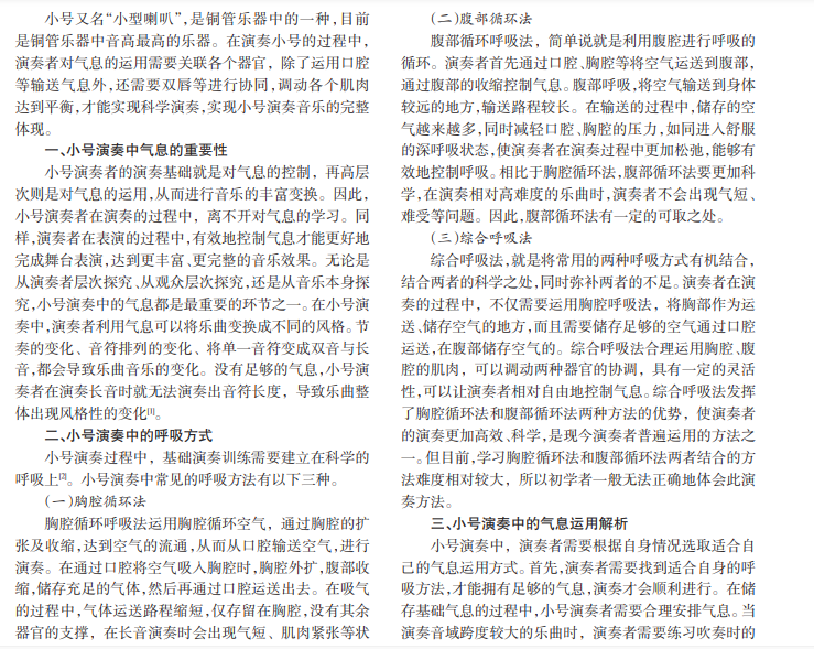 小号属于西方乐器中的管乐乐器,在演奏过程中,非常考验演奏者对气息的运用。气息是控制小号音色、 音高、音量的关键因素,因此,小号演奏者要具备科学运用气息的能力。在演奏的过程中,如何加强气息训练,如何正确 运用气息,成为演奏者的主要研究方向。本文对小号演奏中的气息训练方法以及运用方法等进行了深入的研究。