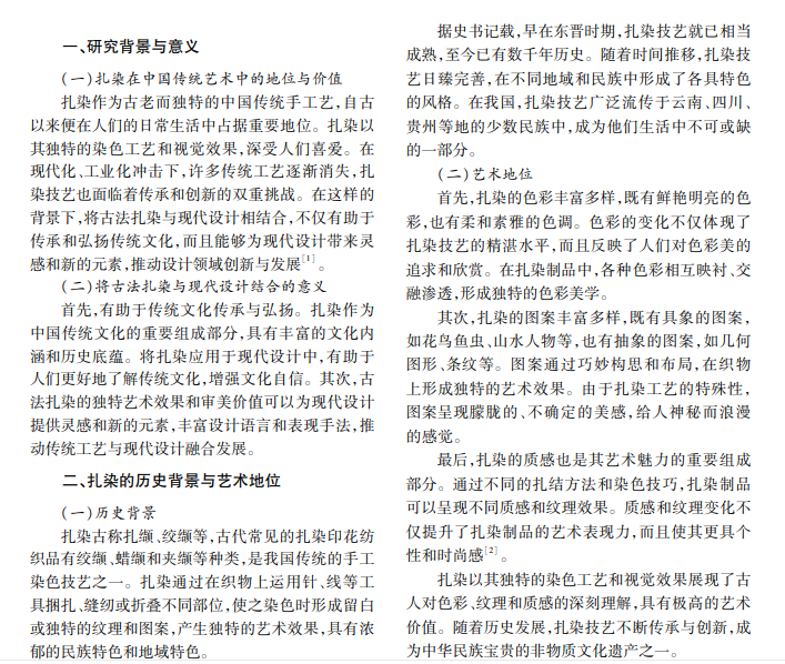 随着现代设计不断发展,扎染技艺作为我国非物质文化遗产之一,逐渐与现代设计元素结合,为现 代设计注入了新的活力。本文探讨古法扎染技艺在现代设计领域的创新应用,分析其价值与意义、应用与发 展、面临的挑战,并提出应对策略,以期为扎染技艺在现代设计中的传承和发展提供参考。