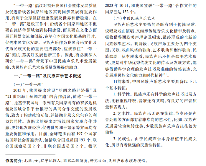 随着“一带一路”倡议的深入推进,沿线各个国家和地区之间的文化交流越发频繁,对我国民族 声乐传播及创新产生了强有力的推动作用。所以我国应抓住新机遇,落实好民族声乐艺术发展建设工作, 使其在新时期绽放新的光彩。本文简要介绍“一带一路”及民族声乐艺术,分析“一带一路”倡议对民族声乐 艺术发展的积极意义,针对“一带一路”背景下中国民族声乐艺术发展策略展开探讨,助推中国民族声乐艺 术发展。