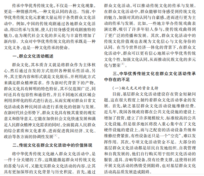 在多元文化思潮不断涌现的今天,重视并传承传统文化尤为重要,中华优秀传统文化蕴含着丰富 的历史故事、智慧与情感。在群众文化活动中传承传统文化,不论是民间美术表演,还是传统节日庆典,都发挥 着至关重要的作用。本文对中华优秀传统文化在群众文化活动中的传承进行分析研究。