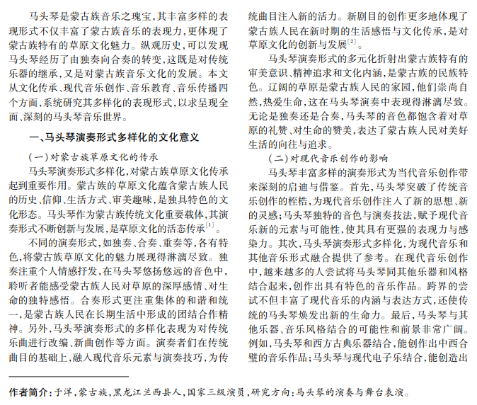 本文探讨马头琴演奏形式多样化的文化意义及其对现代音乐创作、教育与传播的影响,深入研究 马头琴合奏形式的多样化路径。首先,从蒙古族草原文化传承角度,分析马头琴多样化演奏形式在体现蒙古族 独特审美、精神追求、文化内涵上的重要作用。其次,探讨马头琴多样化演奏对现代音乐创作的启示与融合前 景,研究其在音乐教育与传播方面的作用。最后,通过具体曲目分析,探讨马头琴多样化演奏如何实现对蒙古 族草原文化的传承与发展。