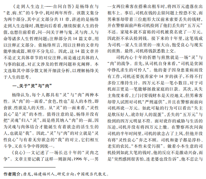 《走到人生边上———自问自答》是一部充满人生智慧和哲学理趣的散文集。在正文部分,杨绛提出 并回答了与人生相关的哲理问题,可以概括为“灵”与“肉”、人与天命和人本身三个主题。在注释部分,杨绛写 作了 14篇散文为正文部分作注。文章以细读方式,针对注释中的部分作品展开分析,研究作品如何具体诠释 正文的三大主题,以此理解杨绛在人生边上的思考。