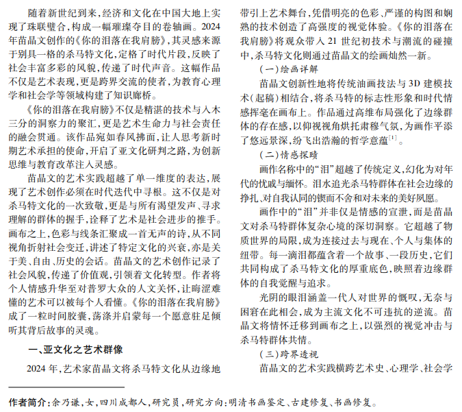 油画《你的泪落在我肩膀》是画家苗晶文对 21世纪初杀马特文化的沉思录和创新实践,该作品通过 数字技术起稿,站在传统油画技法的肩膀上,展现了边缘文化的斑驳陆离。作品深度探讨了艺术与社会心理,重 塑了亚文化分支杀马特文化的定义,激发了其他创作者的革新精神,促进文艺与时代和光同尘。
