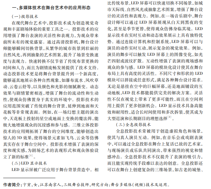 多媒体技术的迅速发展为舞台艺术提供了全新的表现手段,增强了其视觉效果和互动体验。投影 技术、LED显示屏、全息投影和虚拟现实技术的引入,丰富了舞台艺术的表现手段,使其能够实现更生动和动态 的视觉效果,增强观众沉浸感和互动性。本文探讨多媒体技术在舞台艺术中的应用形态及其对艺术表现和观 众体验的影响,分析多媒体技术在舞台艺术中的发展趋势。