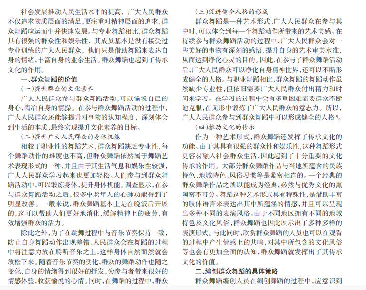 相较于职业舞蹈,群众舞蹈有其独特的特点,它是一种广大人民群众为了丰富业余生活而兴起的大众舞 蹈形式,有浓郁的生活色彩。群众舞蹈本身有很强的文化传播功能,具备一定的艺术价值,对提升广大人民群众的身体 机能具有重要价值。但是,当前优质的群众舞蹈作品数量不多,群众舞蹈的编创人员应编创一些经典作品,切实发挥群 众舞蹈的价值。本文分析了群众舞蹈的价值与编创策略。