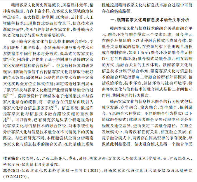 赣南客家文化与信息技术在协同发展过程中融合路径不明确,阻碍了融合进程。本文针对赣南客 家文化与信息技术融合路径,在系统性梳理两者融合关系的基础上构建融合框架,提出五条融合实施路径,分 析各实施路径的特征与应用场景,最后提出融合对策与建议,旨在为赣南客家文化高质量发展及信息技术应用 提供指导。