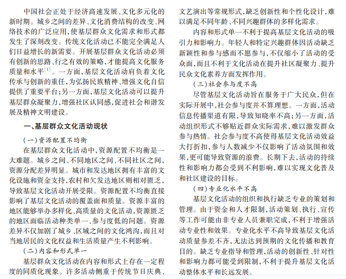 随着时代的发展和社会变迁,基层群众文化活动重要性愈加凸显。文化活动不仅是传承历史与文 化的桥梁,更是提升社会凝聚力与增强文化自信的重要途径。新时代,如何有效开展基层群众文化活动,成为 文化建设的关键课题。本文探讨在当前社会背景下开展基层群众文化活动的有效途径与策略。