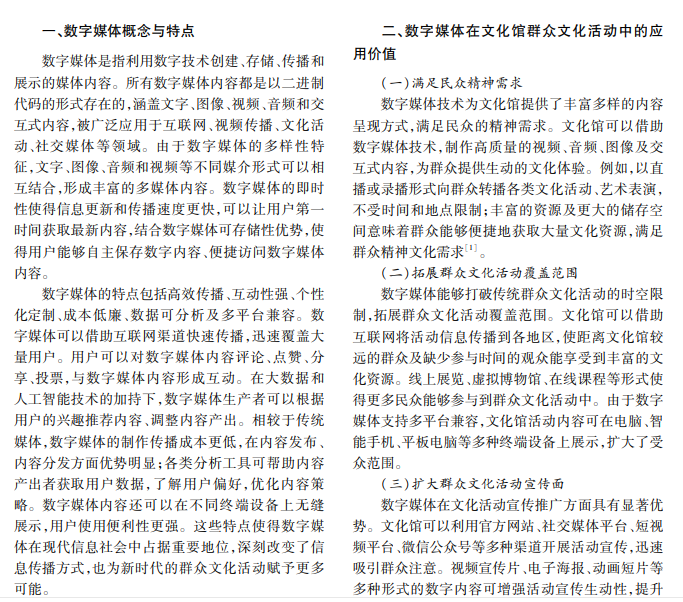 本文简要阐述数字媒体的概念与特点,分析数字媒体在文化馆群众文化活动中的应用价值,提出 数字媒体在文化馆群众文化活动中的可行应用方式及应用保障,以期丰富该领域研究成果,提高文化馆群众文 化工作质量。