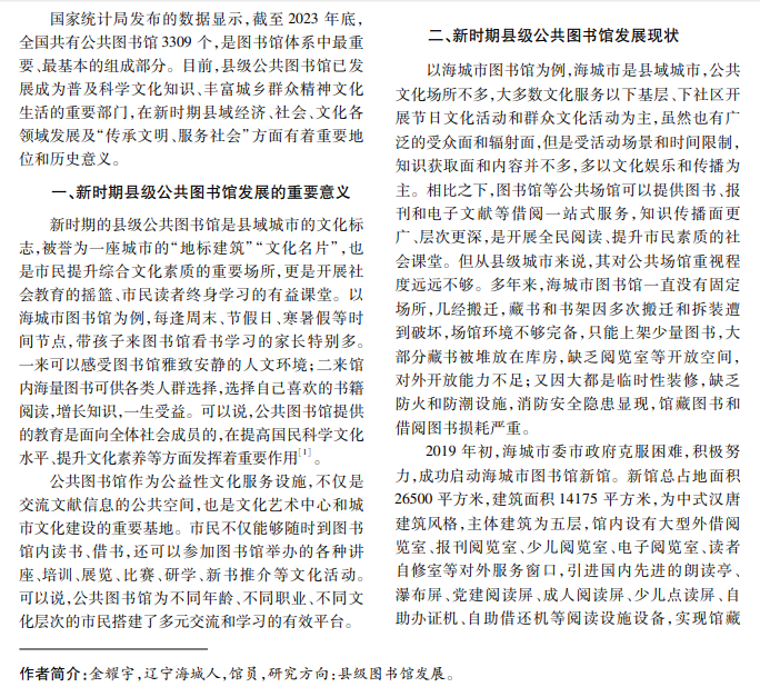 目前,县级公共图书馆在县域经济文化发展中的作用越来越重要,已成为一座城市文化、文明程度 的地标性文化名片。如何利用馆藏资源引领当地文化发展、深化全民阅读,是当今县级公共图书馆发展的方 向。本文以海城市图书馆为例,论述县级公共图书馆的重要意义、发展现状、面临的困难及问题、解决问题的具 体对策等。