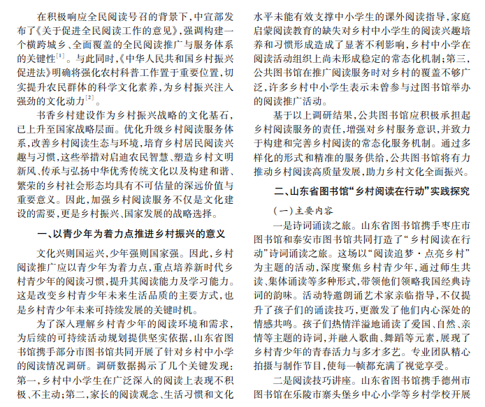 在乡村振兴战略大背景下,乡村阅读作为提升农村文化软实力的重要途径,受到前所未有的重视。 山东省图书馆积极响应国家号召,致力于推动乡村阅读服务发展,以“乡村阅读在行动”为实践平台,深度参与 乡村振兴。本文以山东省图书馆的实践活动为例,探讨公共图书馆在乡村振兴中的重要作用及其实现路径。