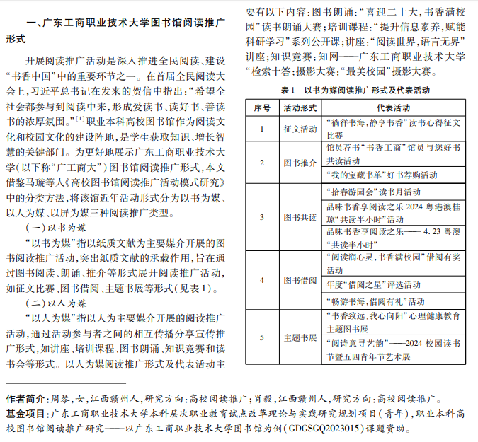 在深入推进全民阅读、建设“书香中国”背景下,职业本科高校图书馆作为推进阅读推广的阵地,对 校园文化建设起着战斗堡垒作用。本文通过问卷调查方式,调查广东工商职业技术大学学生阅读推广现状,从 阅读推广形式、学生阅读基本情况、阅读推广活动开展现状及活动参与情况四方面展开调查分析,以期了解职 业本科高校图书馆阅读推广开展情况及存在问题。