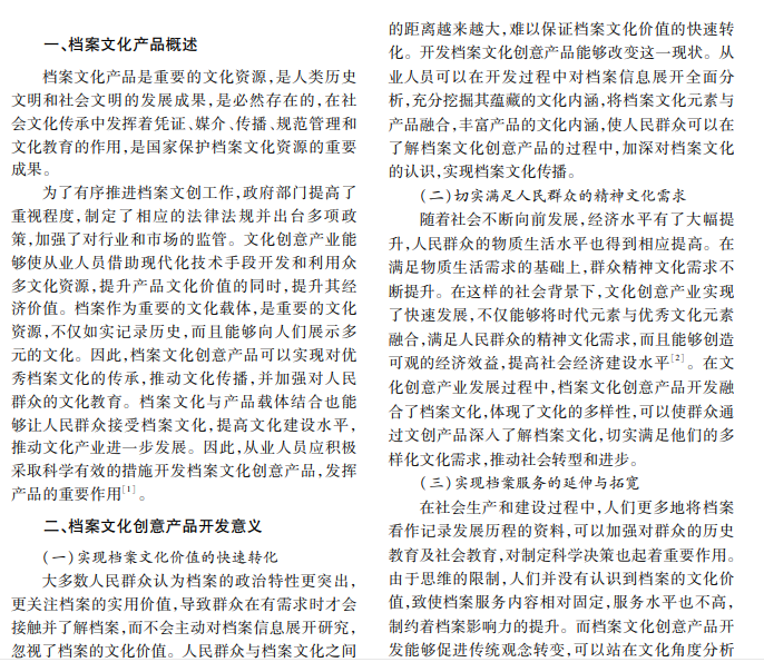 新时期,开发档案文化创意产品,可以实现对档案信息资源的多元化利用,既能够保证档案文化创 意产品的文化价值,又能够发挥档案的经济作用,满足群众的精神文化需求,提升社会文化建设水平。文章围 绕档案文化创意产品的开发展开分析和论述,提出有效的开发策略,希望可以给从业人员提供帮助。