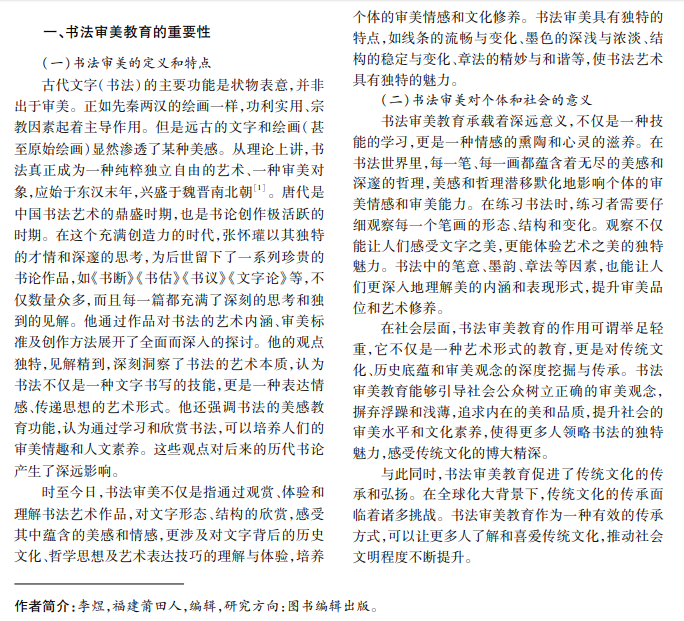 书法是中国传统文化的重要部分,蕴含历史文化内涵和审美价值,对培养个体审美和塑造社会审 美观念至关重要。书法审美不仅是对文字的欣赏,而且是对历史文化、哲学思想及审美情感的体验。书法类图 书是传播书法艺术的关键媒介,对引导大众审美有重要作用。本文探讨书法类图书如何引领大众审美,以为书 法审美教育提供新思路。