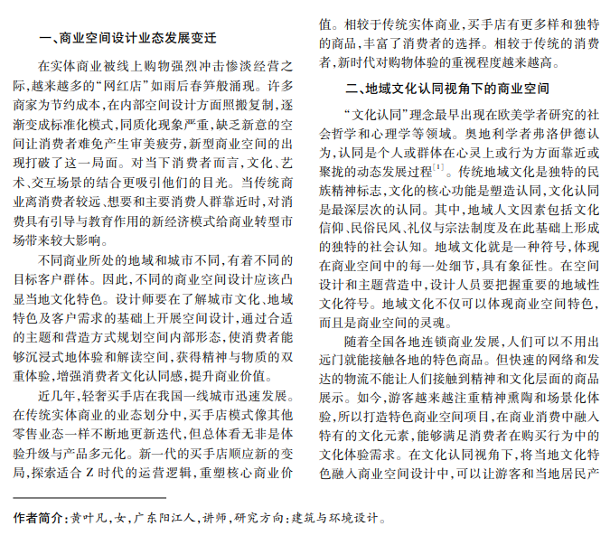 商业空间是传统文化传播与应用的重要场所和展示空间,是地方特色文化融合创新的重要手段。 随着全球化进程加快,将地域文化应用于商业空间设计,有利于促进地域文化可持续发展,更好地传播和创新 商业空间设计。如今,消费者更多选择线上购物,以展示为主的实体商业空间急需转型。本文结合买手店项目 的设计实践,探讨商业空间设计发展趋势,以期为相关领域的设计研究提供参考。