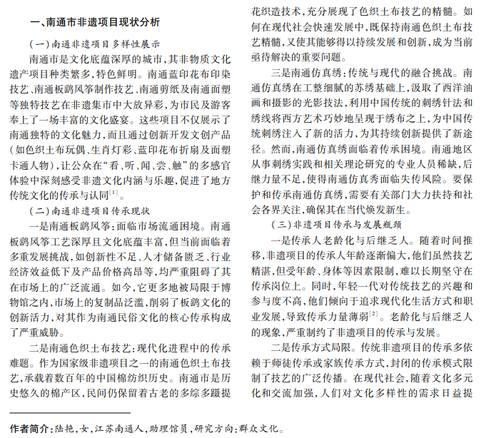 本文以南通市非遗项目为研究对象,从群文视角探讨其传承与创新路径,通过分析南通市非遗项 目现状,提出在新时代背景下更好地保护和传承非遗文化的创新发展策略。