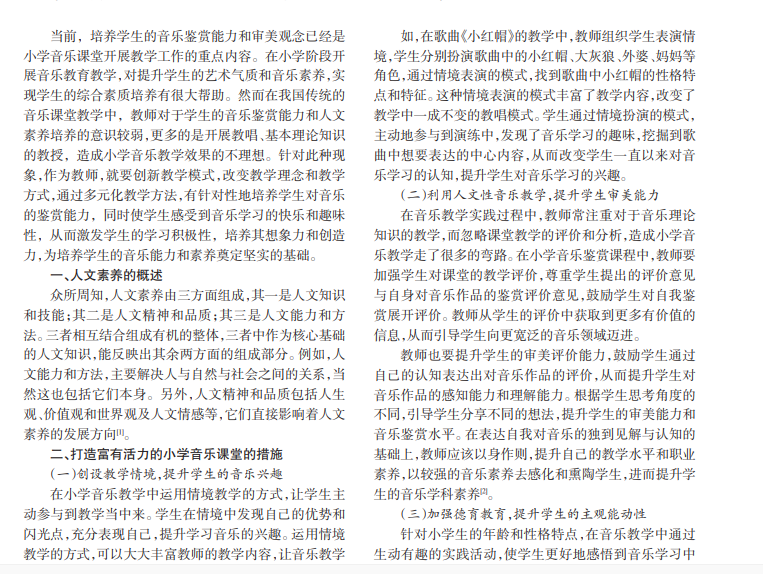 在小学音乐教学中,以学生为中心,培养学生的音乐鉴赏能力,打造富有活力的音乐课堂是教育工作者的 核心内容。小学音乐教学不仅使学生在音乐的熏陶中提升对音乐作品的感知和欣赏能力,还能培养学生的音乐素养和 艺术气质。所以在目前的教学中,教师也着重加强和提升了对学生音乐鉴赏能力的培养,让学生在音乐感知过程中加 深对音乐的情感理解和解读。本文主要探究了彰显人文性、打造富有活力的小学音乐课堂的策略,为提升小学音乐鉴 赏课程的教学质量提出自己的思考和建议。