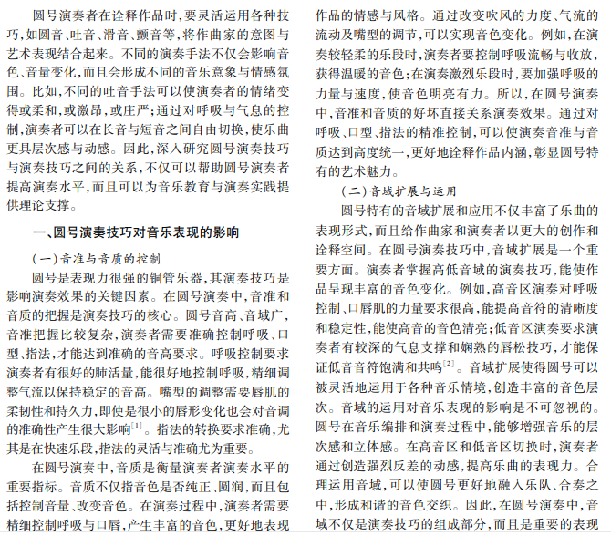 圆号是一种重要的铜管乐器,以其深沉圆润的音色、宽广的音域,在交响乐、室乐和独奏乐曲中大 放异彩。圆号的音色与技巧不仅考验演奏者的技艺,而且关系到作品的情感表达与艺术效果。本文研究圆号 演奏技巧的基本要素及其对音乐的影响,提出提高圆号演奏技巧的策略。