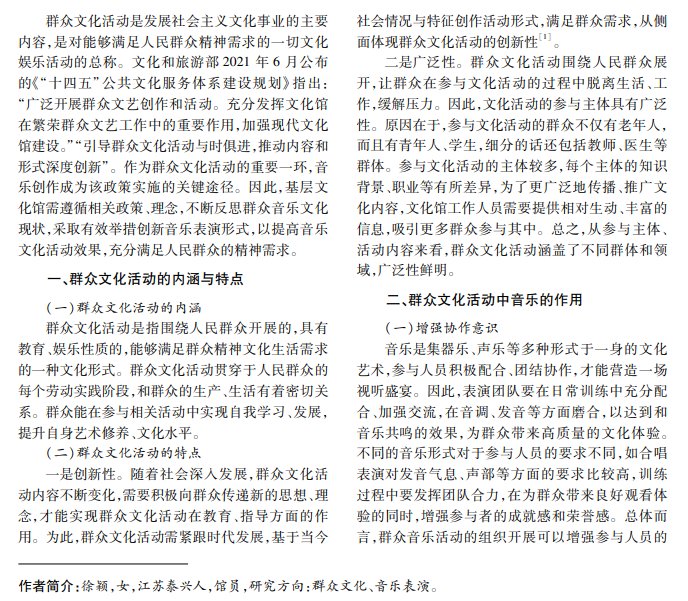随着生活质量不断提升,人们对精神生活提出了多元化要求。在群众文化活动中,音乐表演往往 必不可少。本文介绍群众文化活动的内涵与特点,指出群众文化活动中音乐的作用与现状,探讨音乐表演形式 的创新与发展路径。