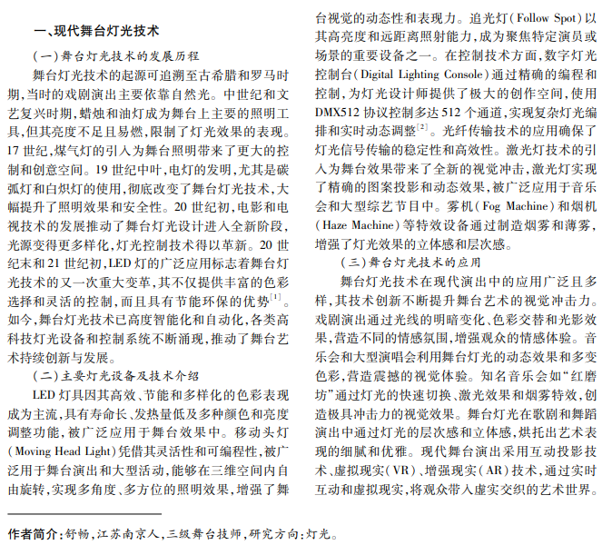 本文探讨现代舞台灯光技术与视觉艺术融合应用,分析两者融合的技术基础、面临挑战及优化路 径,研究灯光设备与视觉艺术的协调性、同步控制和跨领域团队合作的效果。研究认为,通过中间件软件统一 管理、高精度时钟同步系统部署和跨领域团队合作,能够提升舞台演出整体效果和艺术表现力。