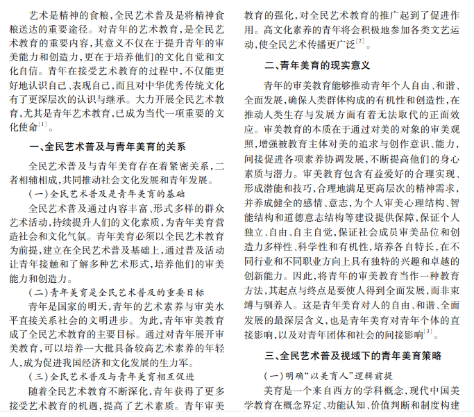 在多元化、快节奏的时代,全民艺术普及尤为重要。青年是国家的明天,其美学素养对国家的文明 建设至关重要。在青年中开展审美教育,可以促使青年创造性思考,促进对人文关怀的关注,既有利于个人发 展,也有利于提高社会文化品位。