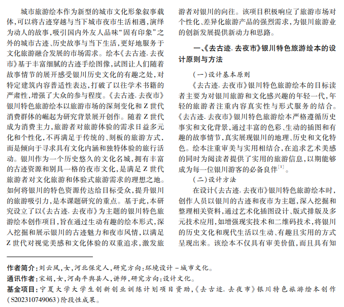 在《去古迹.去夜市》绘本设计中,创作人员寻求个性化的设计手段传递自身对古迹与文化的解读, 利用丰富的媒介交互手段,增强读者感官体验,通过互动操作使读者参与到故事情节发展和空间情境中。该绘 本具有历史价值、艺术价值,成为传播城市文化旅游形象手段之一。