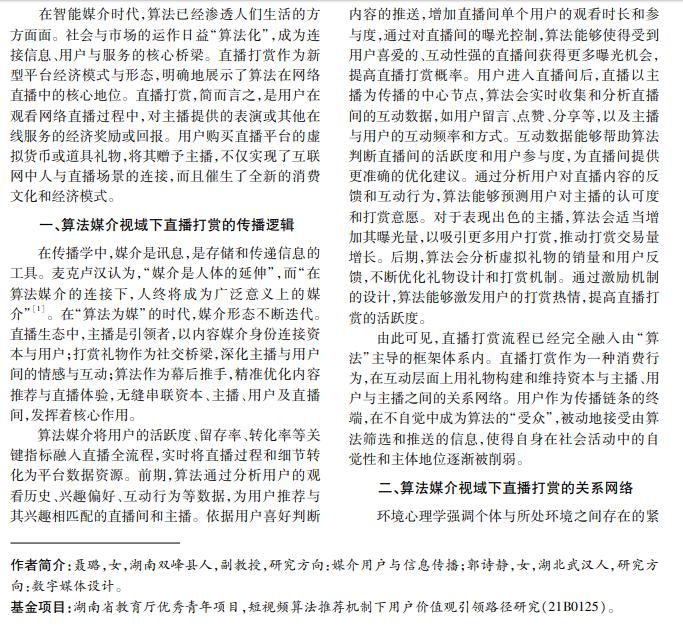 直播打赏在算法媒介推动下构建了平台消费的新模式。用户、主播、礼物和算法交织成直播平台 的“社群—情感—符号—循环”互动关系网络。根据马克思异化理论,其受资本逻辑操控,存在用户炫耀性消费 异化、主播技能与道德的劳动异化及文化资本与经济效益的价值异化等问题,现象背后的推动力是受资本驱动 的算法。