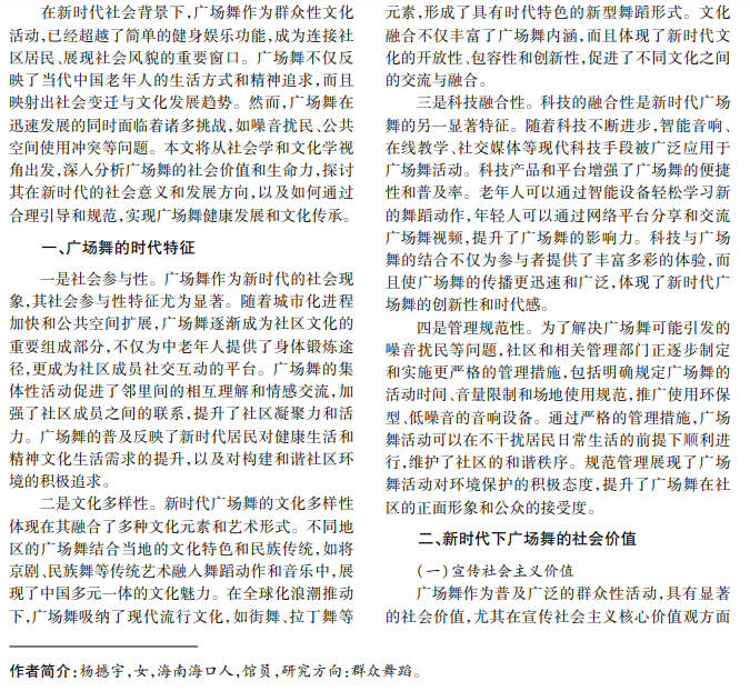 广场舞作为独特的社会文化现象,在中国城乡广泛流行,成为老年人社交和娱乐的重要方式。广 场舞不仅丰富了社区居民的文化生活,而且促进了社会和谐与身心健康。然而,广场舞的噪音问题、场地使用 等引发了社会争议。本文探讨新时代背景下广场舞的社会价值,分析其在促进社区交流、增强群众幸福感及推 动公共文化服务发展等方面的作用,探讨其面临的挑战和解决策略。